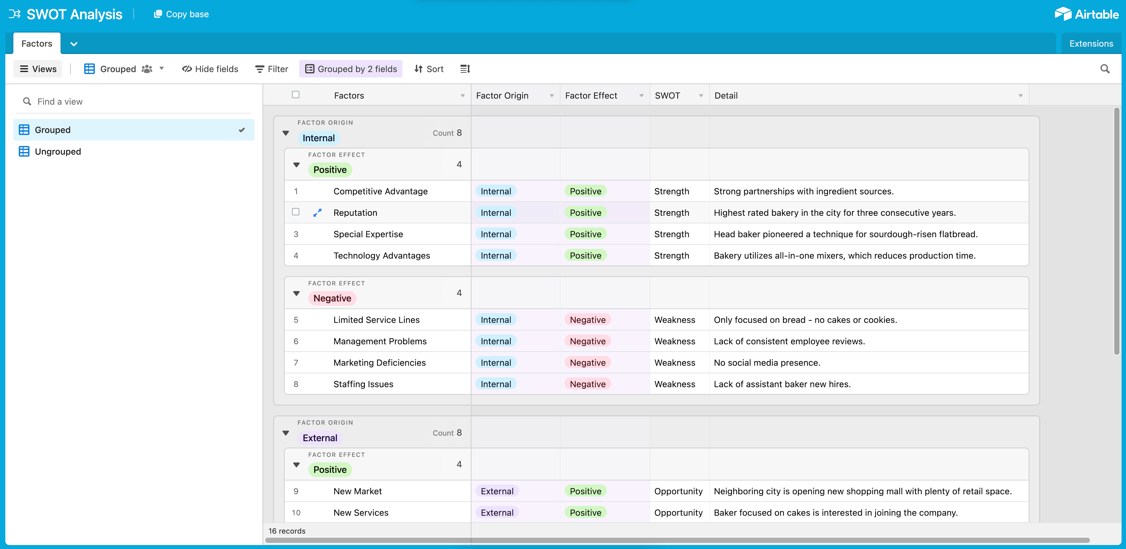 You can format your SWOT analysis however you want, but it’s typical to find them in a spreadsheet or grid. The best way to ensure you’re doing a SWOT analysis correctly is by using a template. Airtable’s template is easy to use, accessible, and customizable for various contexts, stakeholders, and use cases. Below is an example of a SWOT analysis for a hypothetical bakery business.
