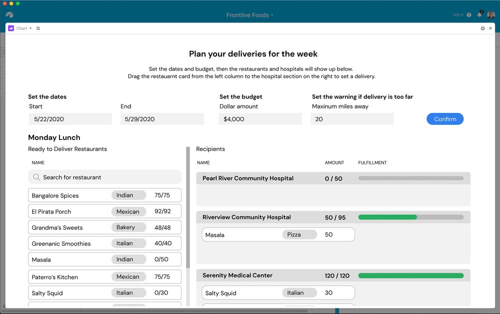 This drag-and-drop app allows local operations leaders to match supply and demand, matching each restaurant’s availability and capacity to fulfill orders for the week. The app also enables volunteers to keep everyone on the same page when deliveries are complex (for instance, when a single hospital encompasses multiple food drop-off sites, each with their own schedule and contact people.)