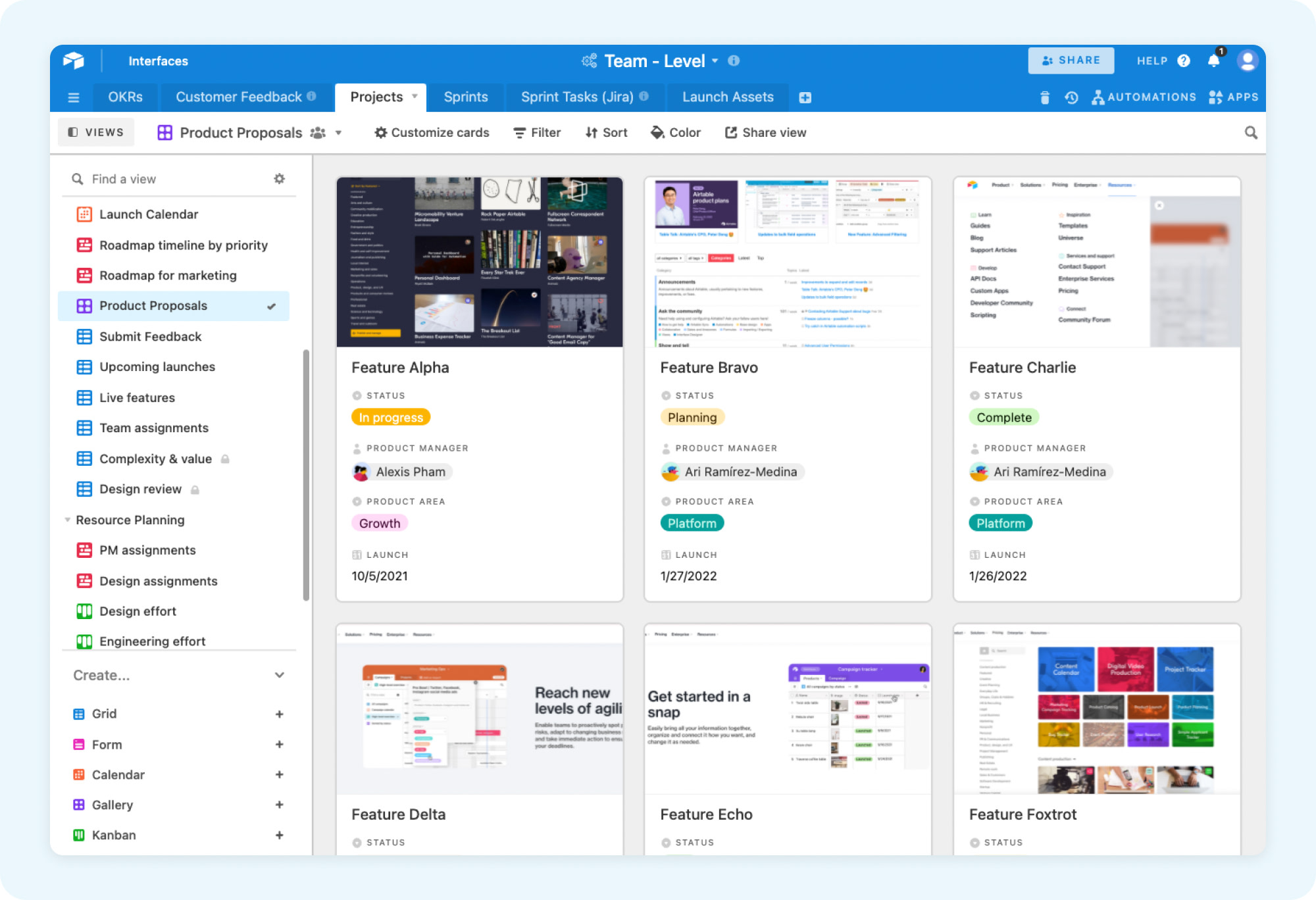 Visualizing project ideas in a gallery view can be useful for helping with prioritization exercises. It also helps with easily finding key artifacts such as Product Requirements Documents.